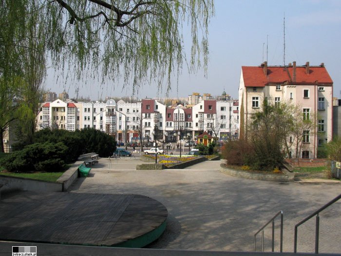 Śródmieście. Charakterystyczne schody do Teatru Ziemi Rybnickiej w widoku na Plac Wolności